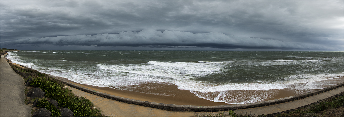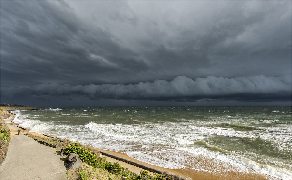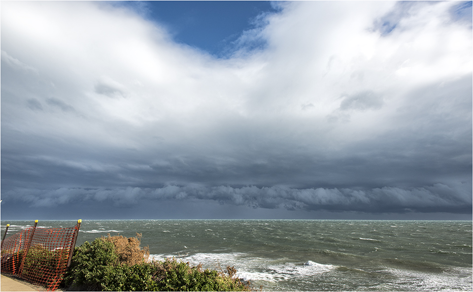The light starts to fail as the cloud advances. Still the strong northerly winds continue to buffet the coast and holding the camera steady becomes even more difficult in the conditions. Fortunately the direction of the wind is such that the local promenade and bluestone retaining wall escape damage on this occasion. The storm that struck the area more recently heralded damaging winds from the west and some of the temporary orange fencing closing off the area to the public can be seen in the image below.