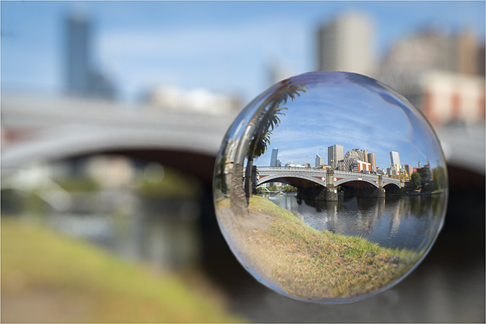 The view of the background while very blurred still resembles the scene to the extent that you can recognise the shapes of the bridge and city buildings. This gives the ball a floating effect, especially if you eliminate the stand in post capture editing.
